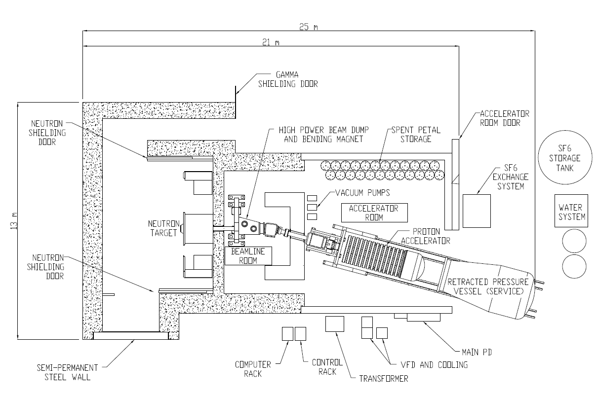 Uses a rotating, solid lithium target for high flux neutron production.