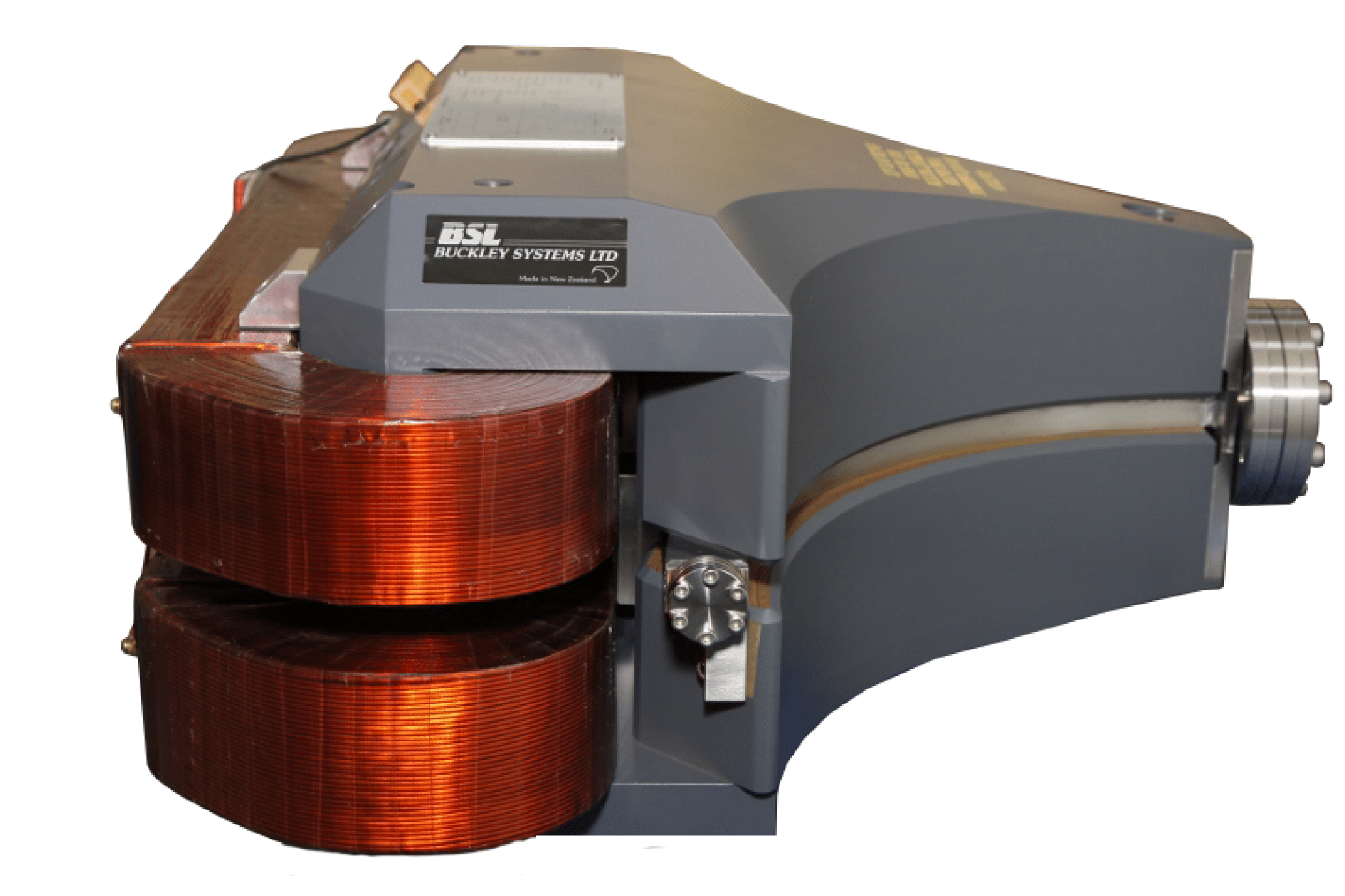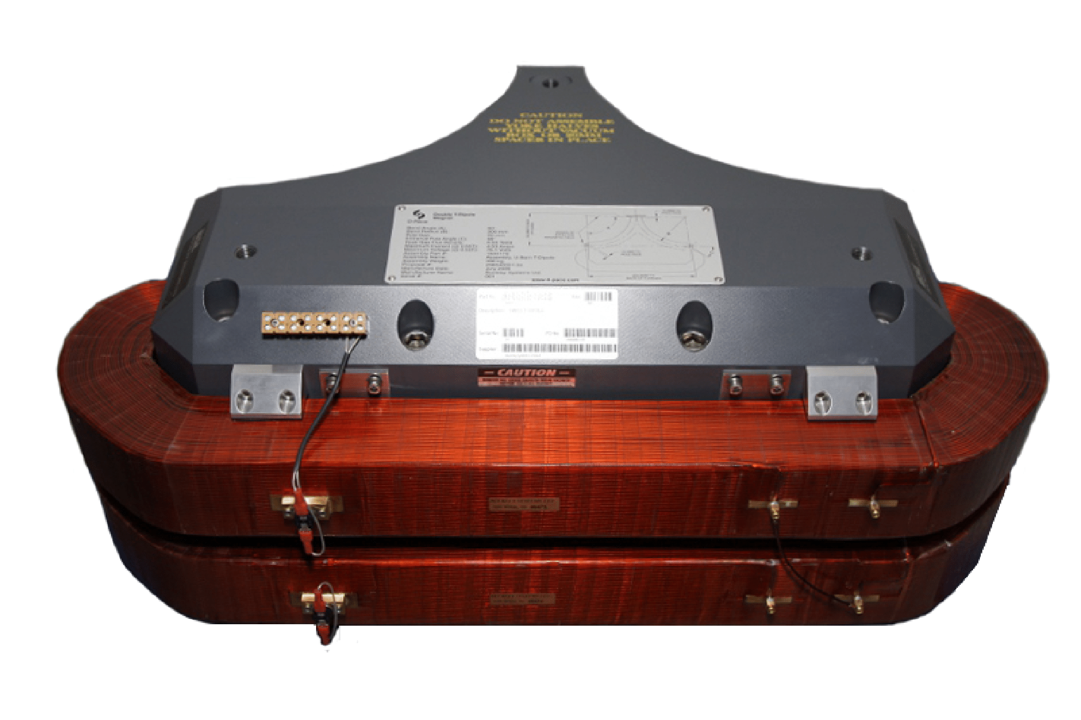 Charged particles may enter the magnet from the left side, back side, or right side, and exit through a common port at the base of the “T”. For example, for cases where all particles are positively charged the magnetic field will have a given polarity to bend charges entering from the left, zero field for cases where charges enter the back of the “T”, and opposite field polarity for cases when the positive particles enter from the right.