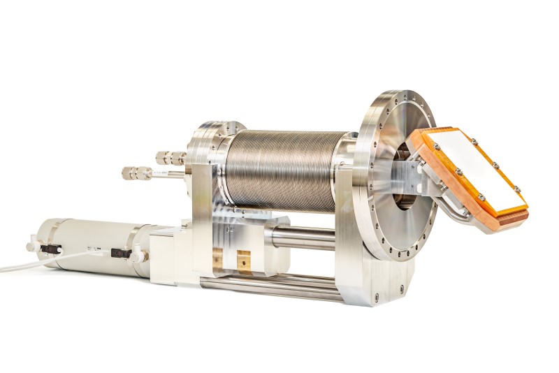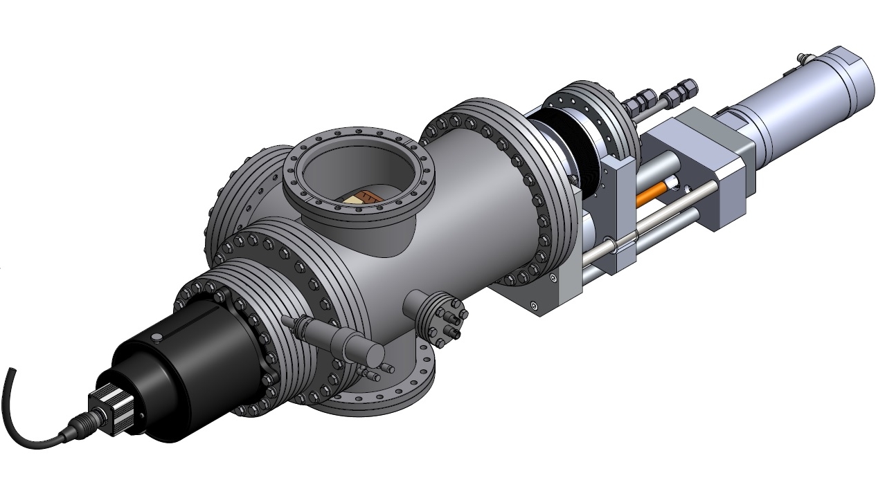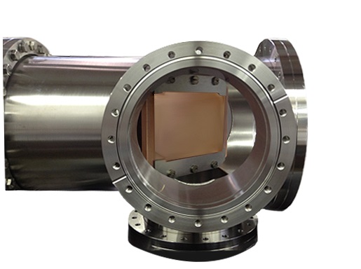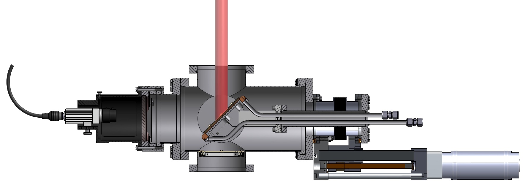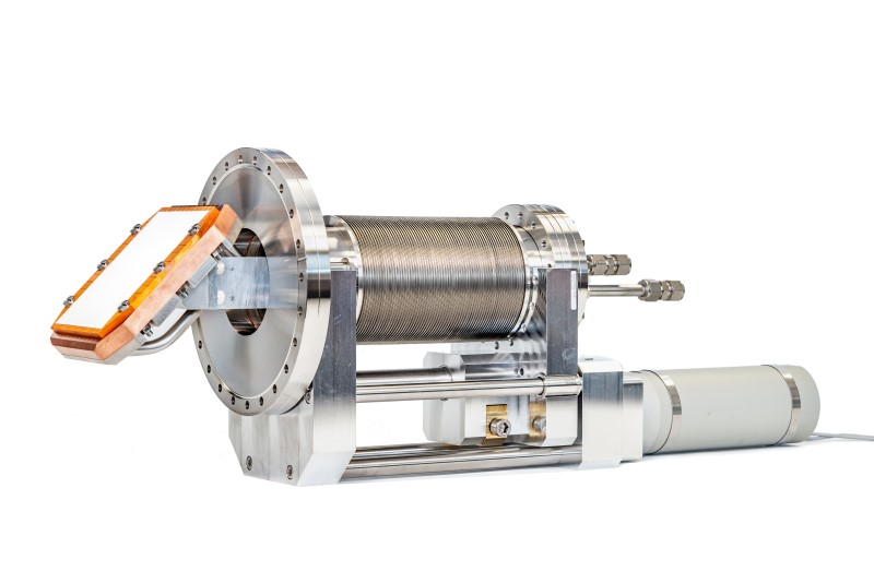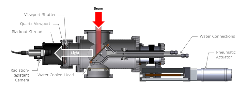 The D-Pace High Power Scintillator allows for real-time monitoring of ion beams, providing immediate information during beam tuning and scanning. The insertable, water-cooled head has an Alumina coating, which scintillates in a on ion beam. The orientation of the head allows a radiation-resistant camera to view the head, outputting a live video signal which can be viewed by the operator. When not in use, the scintillation head can be retraced, and a protection shutter used to shield the viewport from metallic vapors. The head has a power capability of 2 kW of beam power.